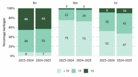 Percentage bo-, sbo- en so-leerlingen naar behaald referentieniveau rekenen in 2024 en 2025.